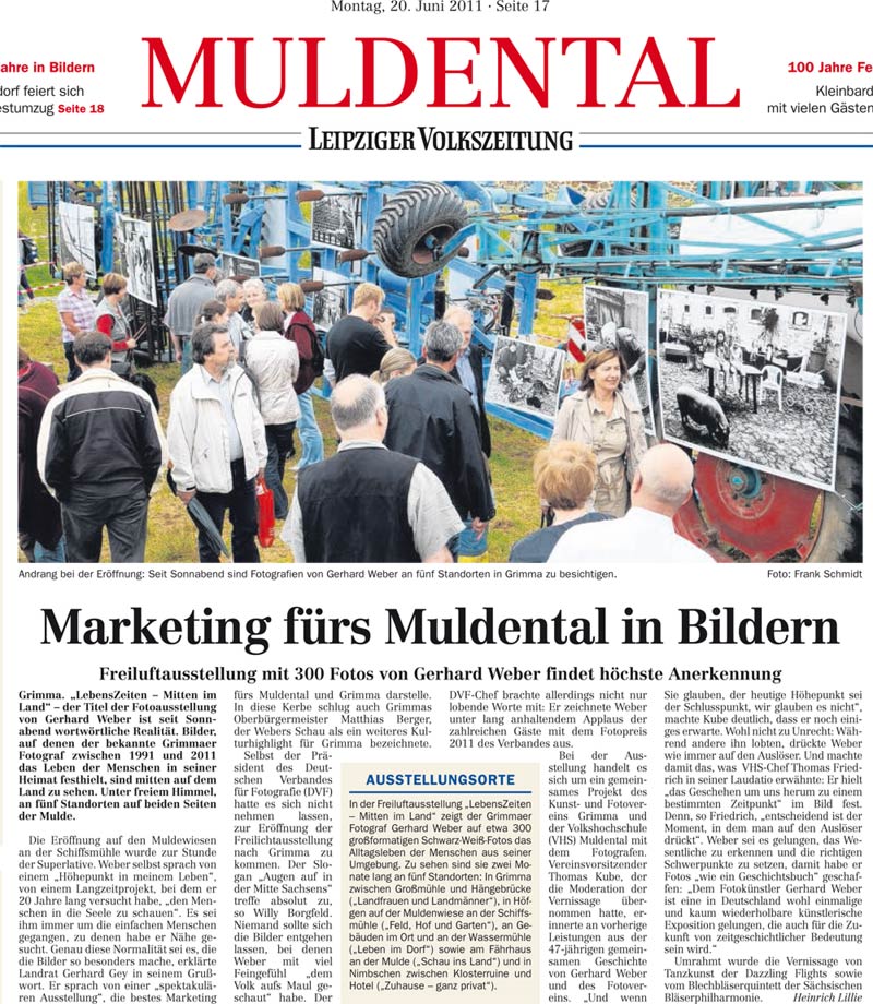 Hier auf den Muldewiesen wird die Ausstellung am Sonnabend, dem 18. Juni 2011 um 16 Uhr feierlich eröffnet. Die Volkshochschule Muldental, ein Partner der "Lebenszeiten"-Fotoausstellung, eröffnet damit zugleich ihr neues Semester. Die Volkshochschule, sagt Weber, werde auch Führungen durch die Ausstellung anbieten. Gruppen können sich freilich auch bei ihm anmelden, doch auch ohne Führung wolle der Fotograf sehr oft vor Ort sein. Trifft man ihn, dann lohnt es sich, Gerhard Weber anzusprechen, der zu fast jedem Bild auf Anhieb etwas erzählen kann.